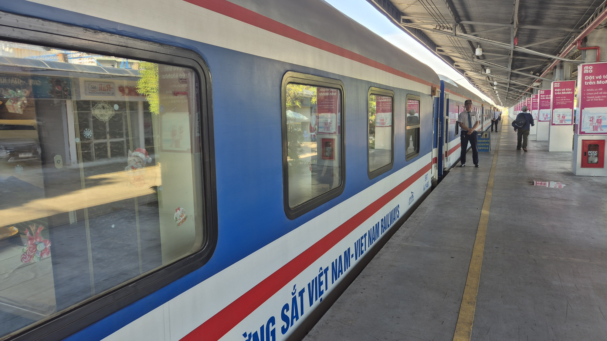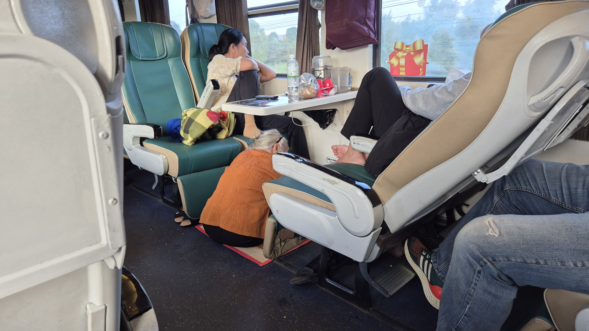 Am 19.12.25 ging die Reise per Zug weiter nach Thap Cham. Vor jedem Wagon stand ein uniformierter Schaffner in weissem Hemd und Krawatte, der uns an unsere vorreservierten Plätze führte. Falls gewünscht, wurde frisch zubereitetes Essen serviert. Nach einer 6h Fahrt, stiegen wir gleichzeitig mit Bisa und ihren 2 wunderbaren Kindern aus. Es war eine herzliche Begegnung. Im Hotel Duc Chinh in Khann Hai hatten wir im 4. Stock ein wunderschönes Zimmer mit Blick aufs Meer sowie einer riesigen Dachterrasse gebucht. Wir waren weit und breit die einzigen Touristen. Wir hatten Glück, dass um die Ecke das einzige offene Restaurant lag. Ein sehr beliebtes Fisch- und Meeresfrüchte Restaurant, das wir gemütlich zu Fuss erreichen konnten. Zufällig feierten dort Bisa mit ihrer Familie den Geburtstag vom 13j. Bin. Spontan wurden wir eingeladen mit zu essen. Die Vietnamesen sind ein sehr herzliches wie auch gastfreundliches Volk.