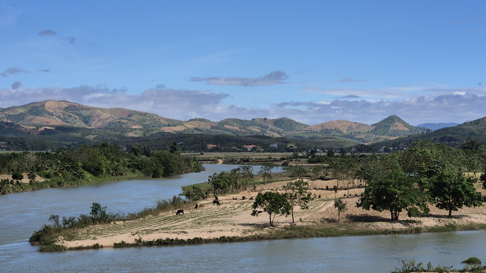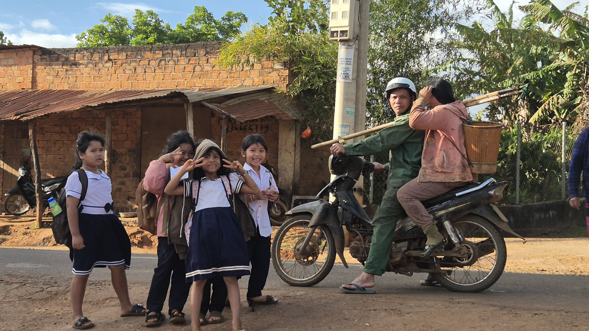 Im nahe gelegenen Dorf Namens Kon k`tu besuchten wir die Bahnar, ein altes indigenes Volk, das ein Teil eines Bergvolkes der Montagnards ist. Die Sprache gehört zu einer Untergruppe der Malayo Polynesischen Sprachgruppe. Die traditionellen Stoffe sind Schwarz rot. Als wir das Gemeinschaftshaus besuchten, wurden wir von den getrennt essenden Frauen sehr freundlich begrüsst. Wie vieler Orts, mischten sich auch hier heidnische wie christliche Bräuche. Vor dem auf Säulen gebauten Gemeinschaftshaus, das nur über einen eingekerbten Baumstamm erreichbar ist, war eine kitschige Krippe aus aufgefüllten Plastiksäcken aufgebaut. Weiter ging die Fahrt über Kautschuk- und Kaffeeplantagen, durch das Dorf Plei Weh Richtung Stausee. Wir sahen Wasserbüffel, Kuhhirte mit Herden und überall fröhlich lachende winkende Kinder, die Hello riefen. Kaum hielten wir an, wurden wir von einer Schar neugieriger Kinder umringt.